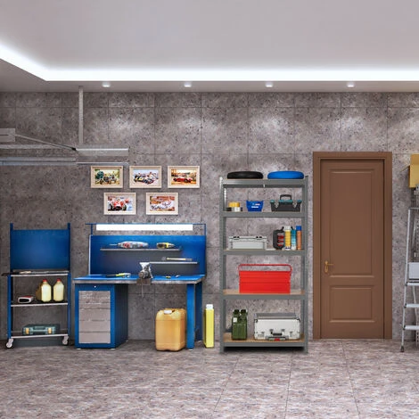 Questo scaffale offre molto spazio per riordinare edè ideale per sopportare anche grandi pesi, sia in cantina, in officina, ingarage, nella dispensa e ovunque ne hai bisogno. Puoi riporre sui ripianipneumatici, attrezzi e altri oggetti pesanti in modo ordinato. La struttura ècompletamente flessibile: puoi fissare i 5 ripiani all’altezza che preferisci o dividere completamente lo scaffale per ottenere 2 mobiletti più piccoli, dautilizzare anche come banco di lavoro.