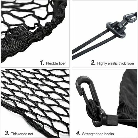 Materiale e dimensioni: questa rete per bagagliaio è realizzata in rete di nylon di alta qualità, rete a rete spessa e non facile da strappare, resistente ed elastica.Le sue dimensioni sono 80 x 60 cm, adatte per la maggior parte di auto, furgoni, camion e SUV.