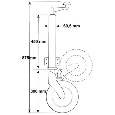 Deve essere regolabile in altezza e fissato in modo che non si possa perdere. Per manovrare o parcheggiare il rimorchio, questa ruota è dotata di uno pneumatico in gomma piena montato su un cerchio di plastica. Il montaggio al timone viene eseguito direttamente o mediante supporti.