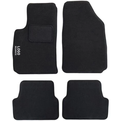 Set tappeti auto su misura in moquette con battitacco in plastica, anteriori e posteriori, con logo ricamato sul tappetino anteriore lato guida. Moquette nera di alta qualit� inodore.