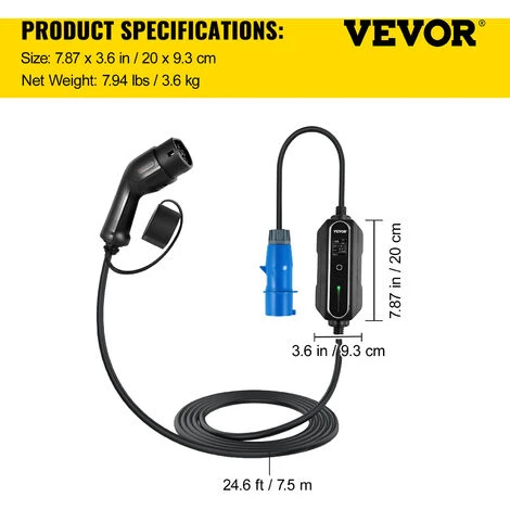 - Velocità di Ricarica Rapida: il caricabatterie portatile per veicoli elettrici VEVOR è progettato per rendere la ricarica dei veicoli elettrici rapida e senza sforzo. Con una spina CEE a 3 pin, potrebbe caricare la tua auto più velocemente di qualsiasi altro caricabatterie EV che hai usato prima. Tensione nominale: 250 V CA, Corrente nominale: 32 A, Potenza nominale: 7,4 kW.