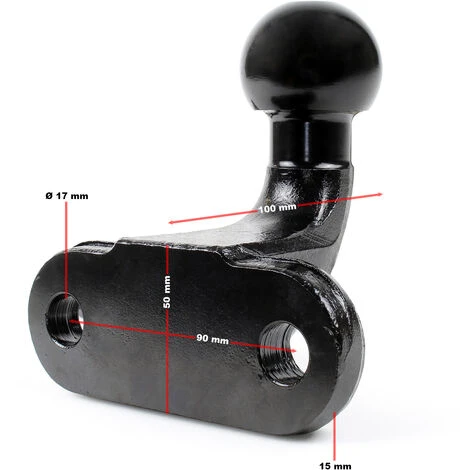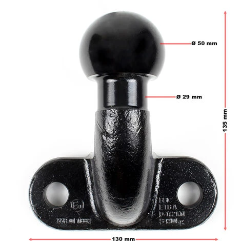 La testa a sfera ha un diametro di 50 mm e il gancio ha il marchio di omologazione E. La piastra di avvitamento è dotata di due fori distanti 90 mm, ciascuno dei quali ha un diametro di 17 mm. Realizzato in acciaio fuso, il gancio è particolarmente robusto e resistente.